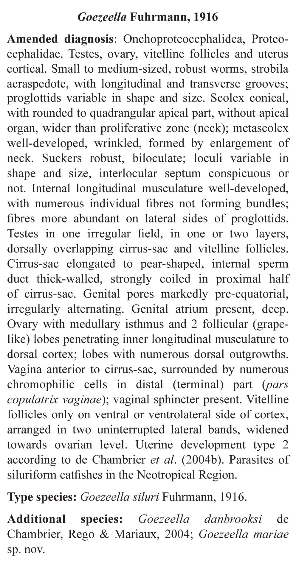 Alves, P., V. A. de Chambrier, J. L. Luque and T. Scholz. 2017. Reappraisal of Goezeella Fuhrmann, 1916 (Cestoda: Proteocephalidae), parasites of Neotropical catfishes (Siluriformes), with description of a new species from Pimelodella cristata (Heptapteridae). Revue suisse de Zoologie 124(2): 355-350. (7114) Download PDF |