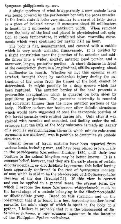 Tunbangui, M. A. 1924. Two larval parasites from the Philippine palm civet (Paradoxurus philippinensis). Philippine Journal of Science 24: 749–755. (7105) Download PDF |