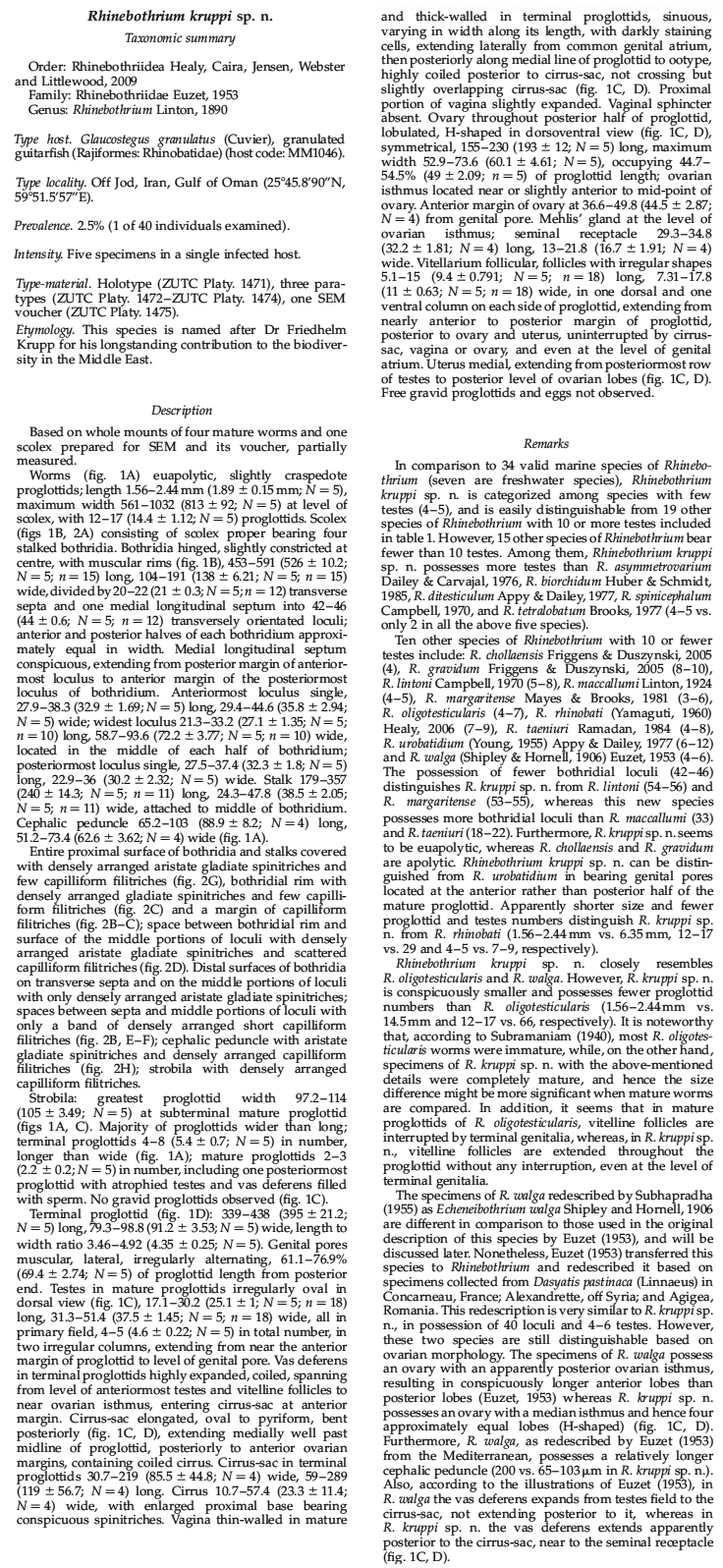 Golestaninasab, M. and M. Malek. 2015. Two new species of Rhinebothrium (Cestoda: Rhinebothriidea) from granulated guitarfish Glaucostegus granulatus in the Gulf of Oman. Journal of Helminthology : 1–14.