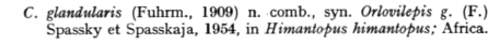 Fuhrmann, O. 1909. Vermes 2. Cestodes. Wissenschftliche Ergebnisse der Schwedischen Zoologischen Expedition nach dem Kilimandjaro, dem Meru und dem umgebenden Massaisteppen Deutsch Ostafrikas 1905-1906 3(22): 11-22. (4758) Download PDFYamaguti, S. 1959. Systema Helminthum. Vol. II. The Cestodes of Vertebrates. Keigaku Publishing House, Tokyo, 860 pp. (694) Download PDF |