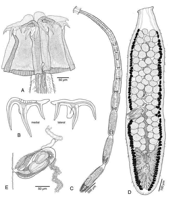 Whole worm (MNHN No. HEL547). D. Terminal, mature proglottid (MNHN No. HEL547). E. Terminal genitalia (MNHN No.