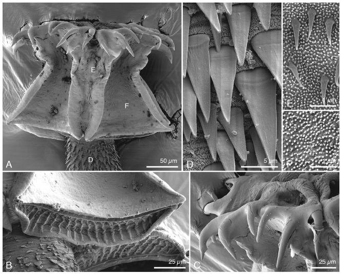 Figures 4D–F. B. Subloculi. C. Pre-hook region and hooks. D. Microtriches on cephalic peduncle. E. Microtriches on proximal