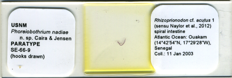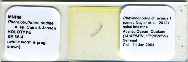 | Type Material | Holotype (MNHN No. HEL547; whole mount of mature worm) and 1 paratype (MNHN No. HEL548; whole mount of 1 mature worm); 3 paratypes (USNM Nos. 1283350–1283352; whole mounts of 1 mature and 2 immature worms); 4 paratypes (LRP Nos. 8750–8753; whole mounts of 1 mature, 1 immature, 1 incomplete worm, and whole-mounted SEM strobilar voucher). Scolex examined with SEM retained at the University of Kansas. |