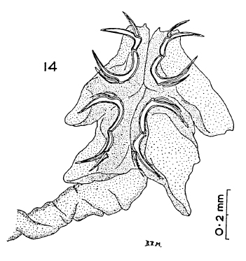 Fig. 14, 15, Megalonchos dubius. 14. apical view of head.