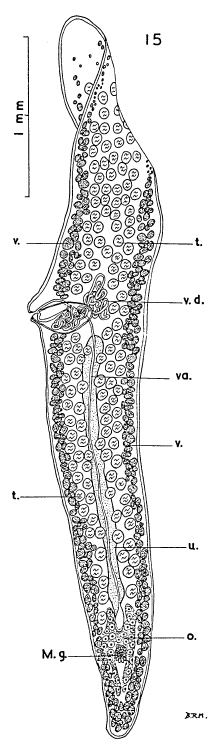 Fig. 14, 15, Megalonchos dubius. 15, free mature segment. M.g., Mehlis' gland; o., ovary; t., testes; u., uterus; v., vitellaria; va., vagina; v.d., vas deferens.