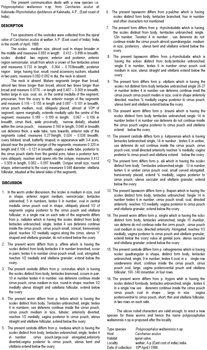 | Scientific Name Notes | Given that type material was neither designated nor deposited for this species described after 1999, Article 16.4 of the International Code of Zoological Nomenclature (ICZN 1999) is violated. This name thus is unavailable for nomenclatural purposes. Several different spellings appear for this new name throughout the original description. It is also not clear if, in addition to the type host, this species was recovered from Rhynchobatus djeddensis. |