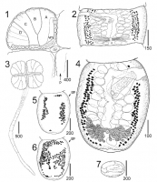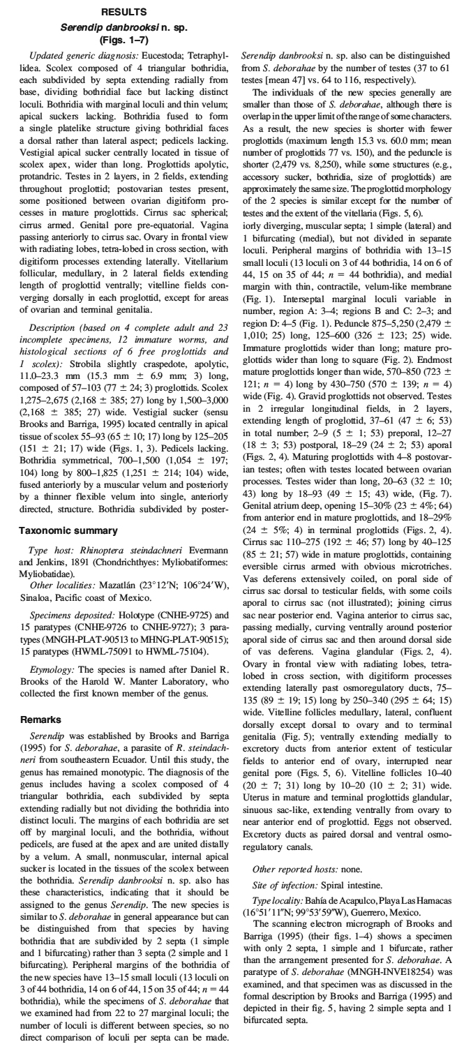 Figures 1–7. Serendip danbrooksi n. sp. 1. Bothridium of scolex indicating interseptal regions A, B, C, and D (medial to lateral, respectively); medial velum interior to small marginal loculi. 2. Mature proglottid. 3. Immature specimen. 4. Terminal attached proglottid; only 31 of 39 testes were drawn. 5. Outline of terminal attached proglottid showing ventral arrangement of vitellaria. 6. Outline of terminal attached proglottid showing dorsal arrangement of vitellaria. 7. Testis of terminal attached proglottid showing internal features. Abbreviations: vm, medial velum; p, peduncle; gp, genital pore. Scale bars in mm.