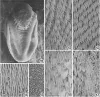 Figures 11-17. Scanning electron micrographs of Echinobothrium mexicanum n. sp. 11. Scolex proper. 12. Three- and 4-digit palmate microtriches on anterior proximal bothridal surface. 13. Three-, 4-, and 5-digit palmate microtriches on proximal medial bothrial surface. 14. Slender spiniform and long, robust filiform microtriches (arrow) on distal bothrial surfaces. 15. Short filiform microtriches on medial distal bothrial surfaces. 16. Five- and 6-digit palmate microtriches on posterior proximal bothrial surface. 17. Lateral margin of bothria showing border between palmate and slender filiform microtriches. Scale bar in Figure 11. 50 µm. Scale bars in Figures 12-14, 16. 2 µm. Scale bar in Figure 15. 1 µm.