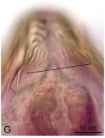 From Caira et al 2013 (Cit# 6204). Fig. 1. Light micrographs showing diphyllidean scolex armature. (G) Apical organ armature of Halysioncum mexicanum; bracket indicates continues band of lateral hooklets.