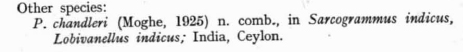 Moghe, M. A. 1925. A new species of Monopylidium, M. chandleri, from the red nettled lapwing (Sarcogrammus indicus Stoliczka), with a key to the species of Monopylidium. Parasitology 17: 395-400. (3070) Download PDFYamaguti, S. 1959. Systema Helminthum. Vol. II. The Cestodes of Vertebrates. Keigaku Publishing House, Tokyo, 860 pp. (694) Download PDF |