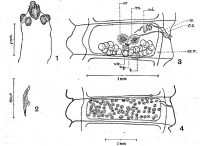 Fig. 1. Scolex with a portion of unsegmented region. x20. Fig. 2. A hook on the rostellum. x160. Fig. 3. A mature proglottis. x44. c.s. cirrus-sac; ex.v. excretory vessel; ov. ovary; r.s. receptaculum seminis; s.g. shell gland; t. testes; v. vagina; v.d. vas deferens; vit. vitelline gland. Fig. 4. A gravid proglottis. x20.