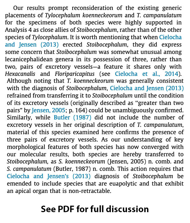 Jensen, K. 2005. Tapeworms of Elasmobranchs (Part I). A monograph on the Lecanicephalidea (Platyhelminthes, Cestoda). Bulletin of the University of Nebraska State Museum 18: 1-241. (4502) Download PDFJensen, K., J. N. Caira, J. J. Cielocha, D. T. J. Littlewood & A. Waeschenbach. 2016. When proglottids and scoleces conflict: phylogenetic relationships and a family-level classification of the Lecanicephalidea (Platyhelminthes: Cestoda). International Journal for Parasitology 46(5–6): 291–310. (6738) Download PDF |