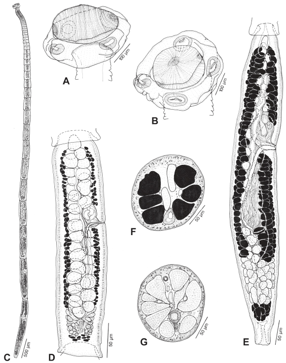 Fig. 59. A-G. Line drawings of Tylocephalum koenneckeorum Jensen, n. sp. A. Scolex, lateral view (QM No. G 222925). B. Scolex, apical view (LRP No. 3335). C. Whole worm (holotype, QM No. G 222924). D. Early mature proglottid (QM No. G 222926). E. Mature terminal proglottid (USNPC No. 94582). F. Cross-section through mature proglottid anterior to genital pore (QM No. G 222930). G. Cross-section through mature proglottid at level of ovary (QM No. G 222930).