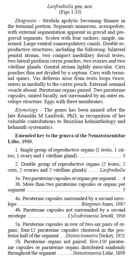 Melo, F. T., E. G. Giese, A. P. Furtado, M. J. Soares, E. C. Gonçalves, A. C. Vallinoto and J. N. Santos. 2011. Lanfrediella amphicirrus gen. nov. sp. nov. Nematotaeniidae (Cestoda: Cyclophyllidea), a tapeworm parasite of Rhinella marina (Linnaeus, 1758) (Amphibia: Bufonidae). Memórias do Instituto Oswaldo Cruz 106(6): 670-677. (6823) |