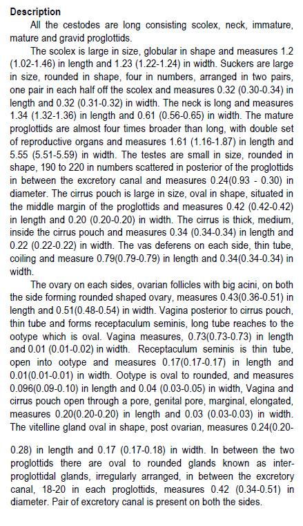 Humbe, A, S. Jadhav, and S. Borde. 2011. On a new species of Moniezia babai Blanchard, 1891 (Cestoda: Anoplocephalidae) from Capra hircus (L.) from Buldhana district (M. S.) India. International Multidisciplinary Research Journal 1 (8): 1-3. (7258) |