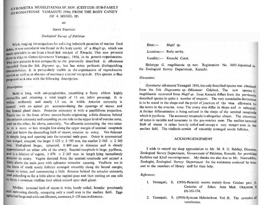 Parveen, I. 1971. Gyrometra mugilitaenia sp. nov. (Cestode: subfamily Gyromatrinae [sic] Yamaguti, 1954) from the body cavity of a Mugil sp. Records, Zoological Survey of Pakistan 2: 145-153. (7368) Download PDF |