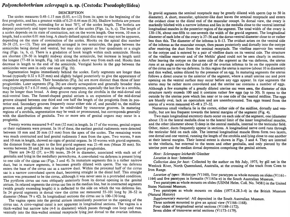 Blair, D. 1978. Polyonchobothrium scleropagis n. sp. (Cestoda: Pseudophyllidea) from the Australian osteoglossid fish Scleropages leichardti Günther. Journal of Helminthology 52(2): 147-153. (5951) Download PDF |
