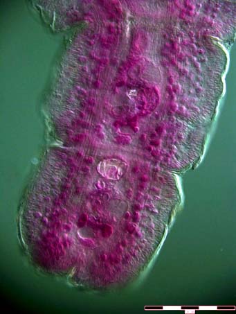 Fig. 4: Dorsal view of a typical ripe proglottis showinf the distribution of testes and vitellaria and the lateral extent of the internal longitudinal muscles.