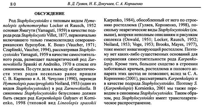 Gulyaev, V. D., N. E. Dokuchaev, and S. A. Kornienko. 2007. [The cestodes of genus Staphylocystoides Yamaguti, 1959 (Cestoda, Hymenolepididae) in shrews of Berengia] (In Russian). Bulletin of the North-East Scientific Center, Russia Academy of Sciences Far East Branch 4: 75–84.