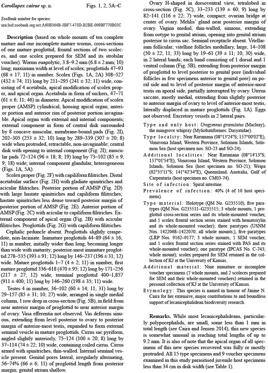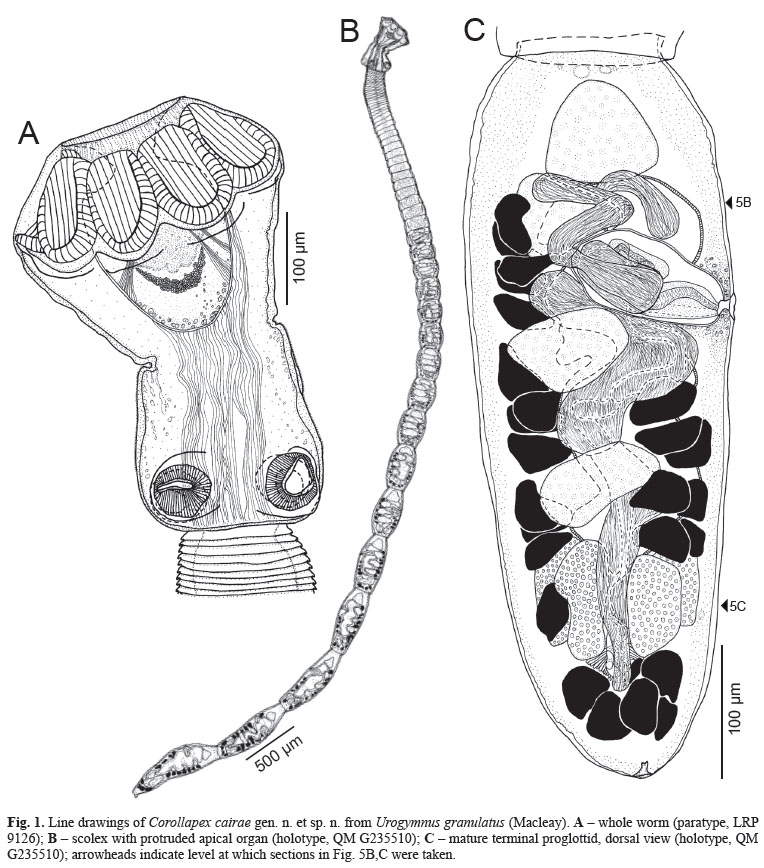 | Type Material | Holotype (QM No. G235510), five paratypes (QM Nos. G235511–G235515; 3 whole mounts, 1 proglottid cross-section series and its whole-mounted voucher, and 1 scolex frontal section series stained with hematoxylin and its whole-mounted voucher); three paratypes (USNM Nos. 1422068–1422070; all whole mounts;), five paratypes (LRP Nos. 9162–9177; 3 whole mounts, 1 SEM voucher, and 1 scolex frontal section series stained with PAS and its whole-mounted voucher); one paratype (IPCAS No. C-743; whole mount); scolex prepared for SEM retained in the collection of KJ at the University of Kansas |