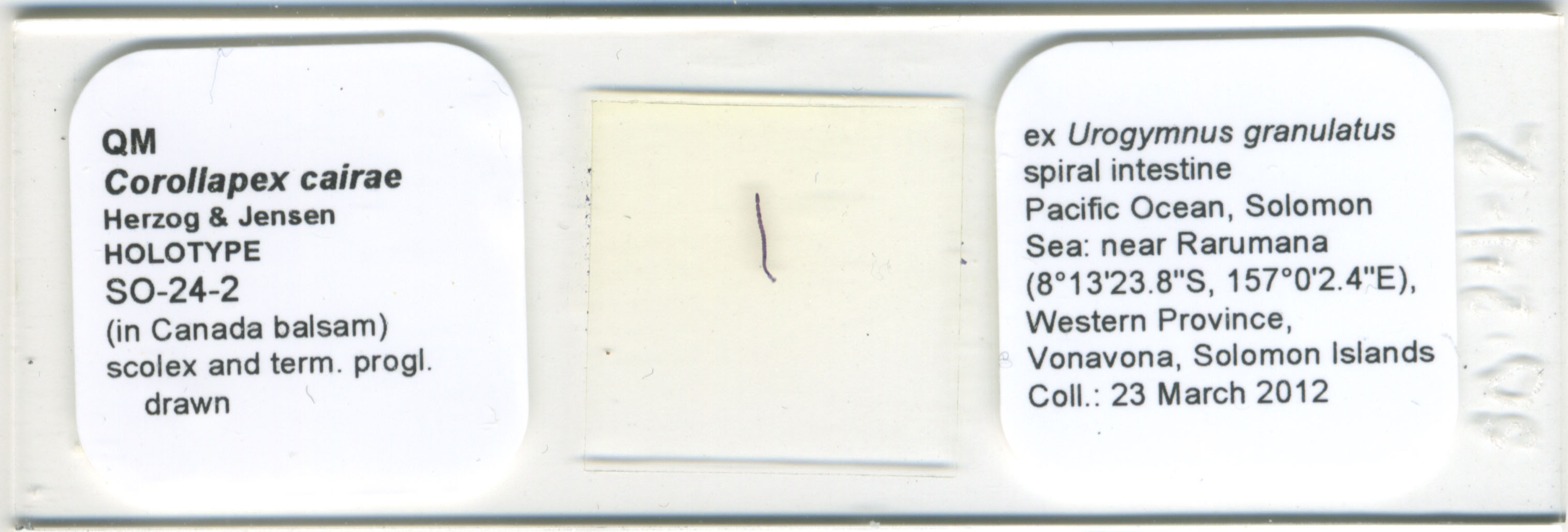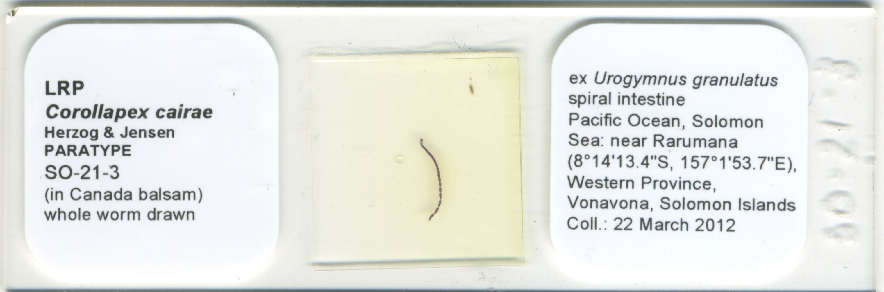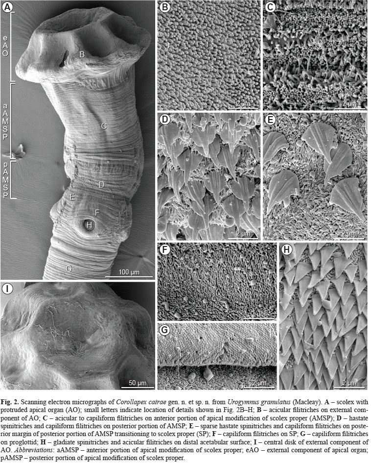 | Total Number of Type Specimens | 10 whole mounts, 1 terminal proglottid cross-section series, two scolex frontal section series, one scolex prepared for SEM and its deposited strobilar voucher |