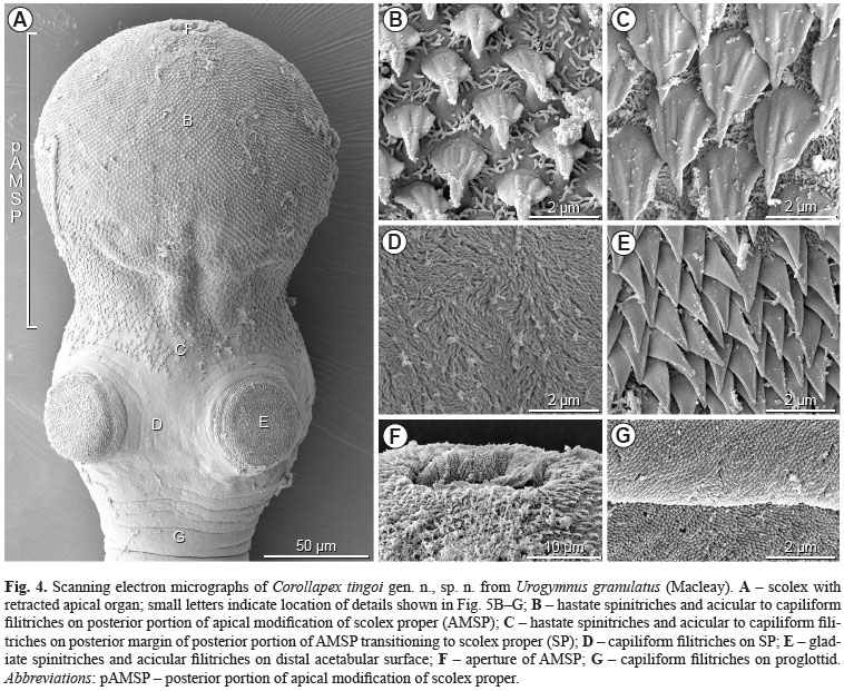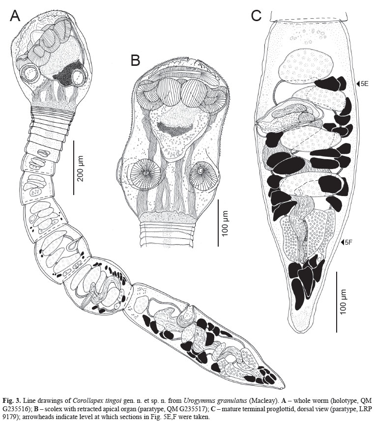 Type Material Holotype (QM No. G235516), six paratypes (QM Nos. G235517–G235522; 4 whole mounts, 1 proglottid cross-section series and 1 scolex frontal section series stained with hematoxylin, and their whole-mounted vouchers); five paratypes (USNM Nos. 1422071–1422075; all whole mounts); four paratypes (LRP Nos. 9178–9186; 3 whole mounts and 1 scolex frontal section series stained with hematoxylin and its whole-mounted voucher); one paratype (IPCAS No. C-744; whole mount); one scolex prepared for SEM and its whole-mounted voucher, and two whole worms prepared for SEM retained in the collection of KJ at the University of Kansas