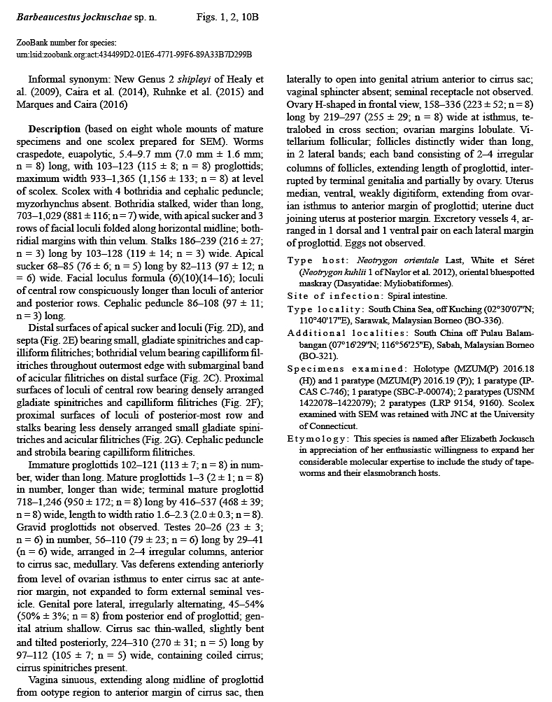 | Type Material | Holotype (MZUM(P) 2016.18 (H)) and 1 paratype (MZUM(P) 2016.19 (P)); 1 paratype (IPCAS C-746); 1 paratype (SBC-P-00074); 2 paratypes (USNM 1422078–1422079); 2 paratypes (LRP 9154, 9160). Scolex examined with SEM was retained with JNC at the University of Connecticut. |