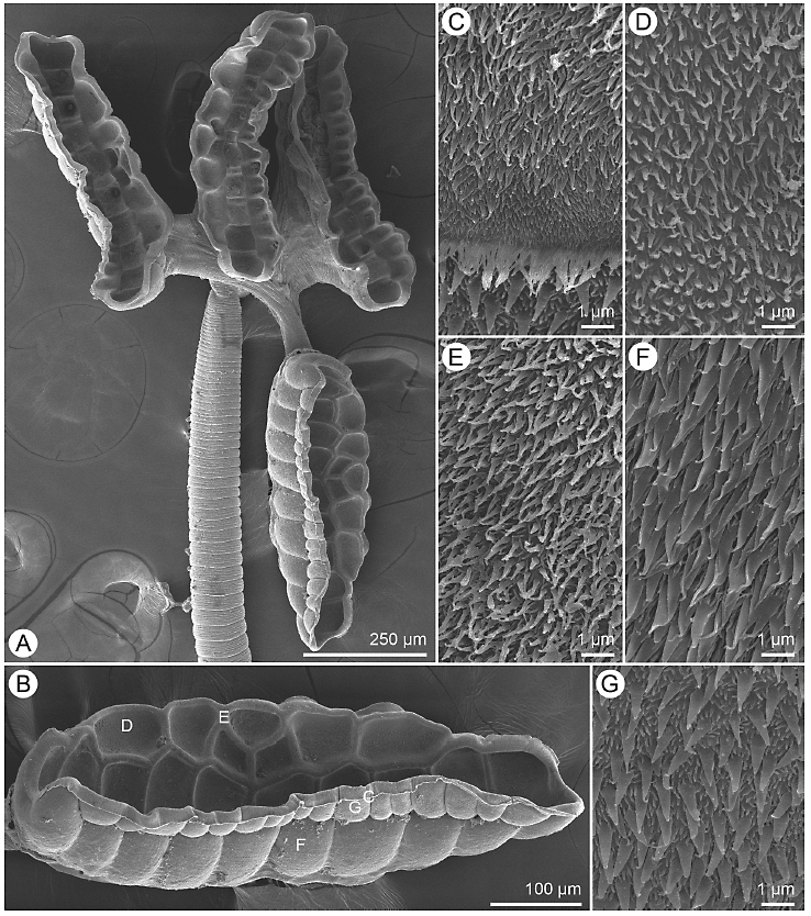 B – bothridium; small letters indicate location of details shown in Fig. 2C–G; C – distal surface of bothridial velum; D – distal surface