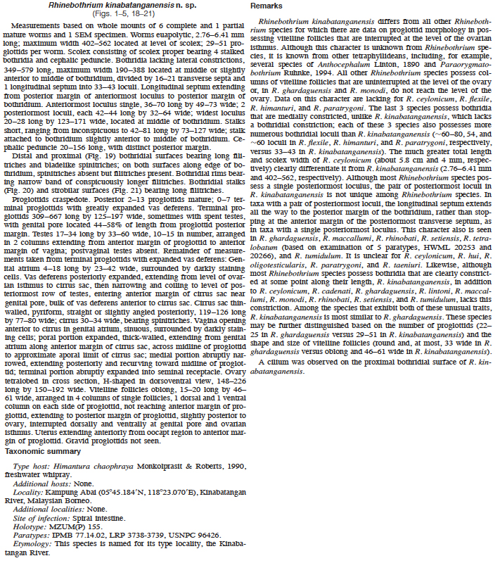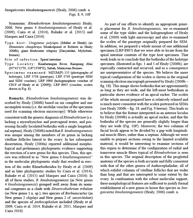 | Synonyms | Rhinebothrium kinabatanganensis Healy, 2006; New genus 4 kinabatanganensis of Healy et al. (2009), Caira et al. (2014), Ruhnke et al. (2015) and Marques and Caira (2016) |