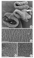 kinabatanganensis n. sp. (18) Scolex; transverse septa (1 indicated by an arrowhead) and longitudinal septum (arrow) visible in the open bothridium. (19) Proximal bothridial surface. (20) Stalk surface. (21) Proglottid