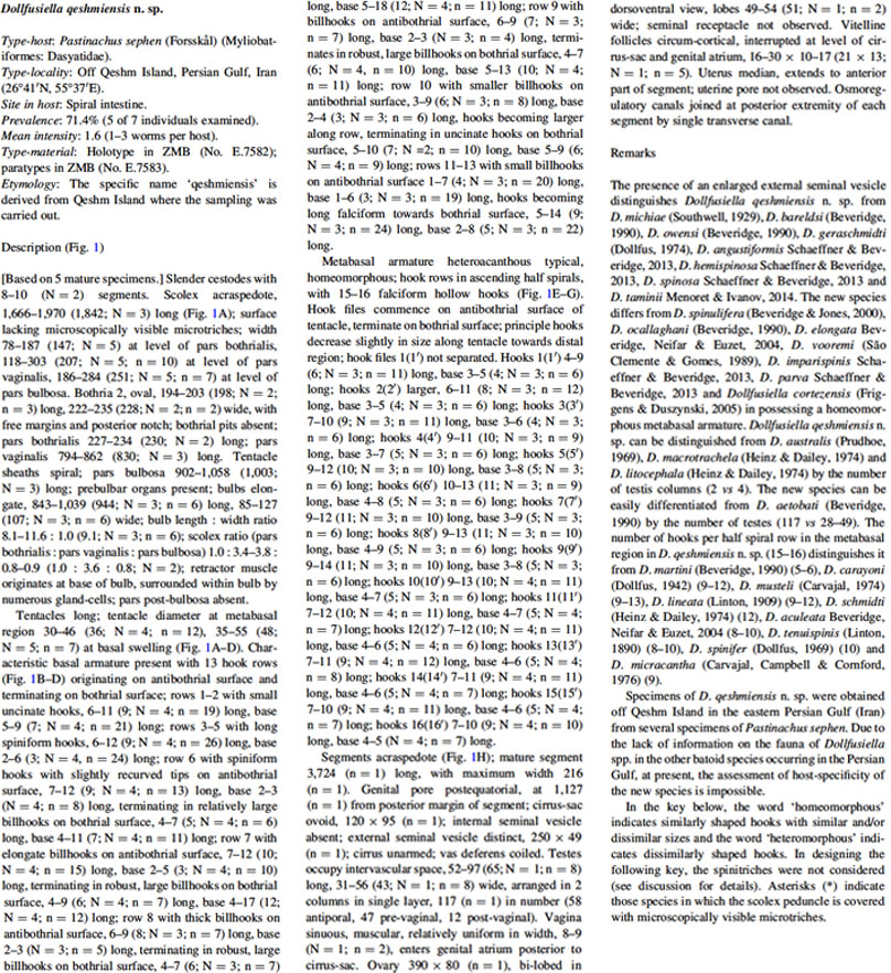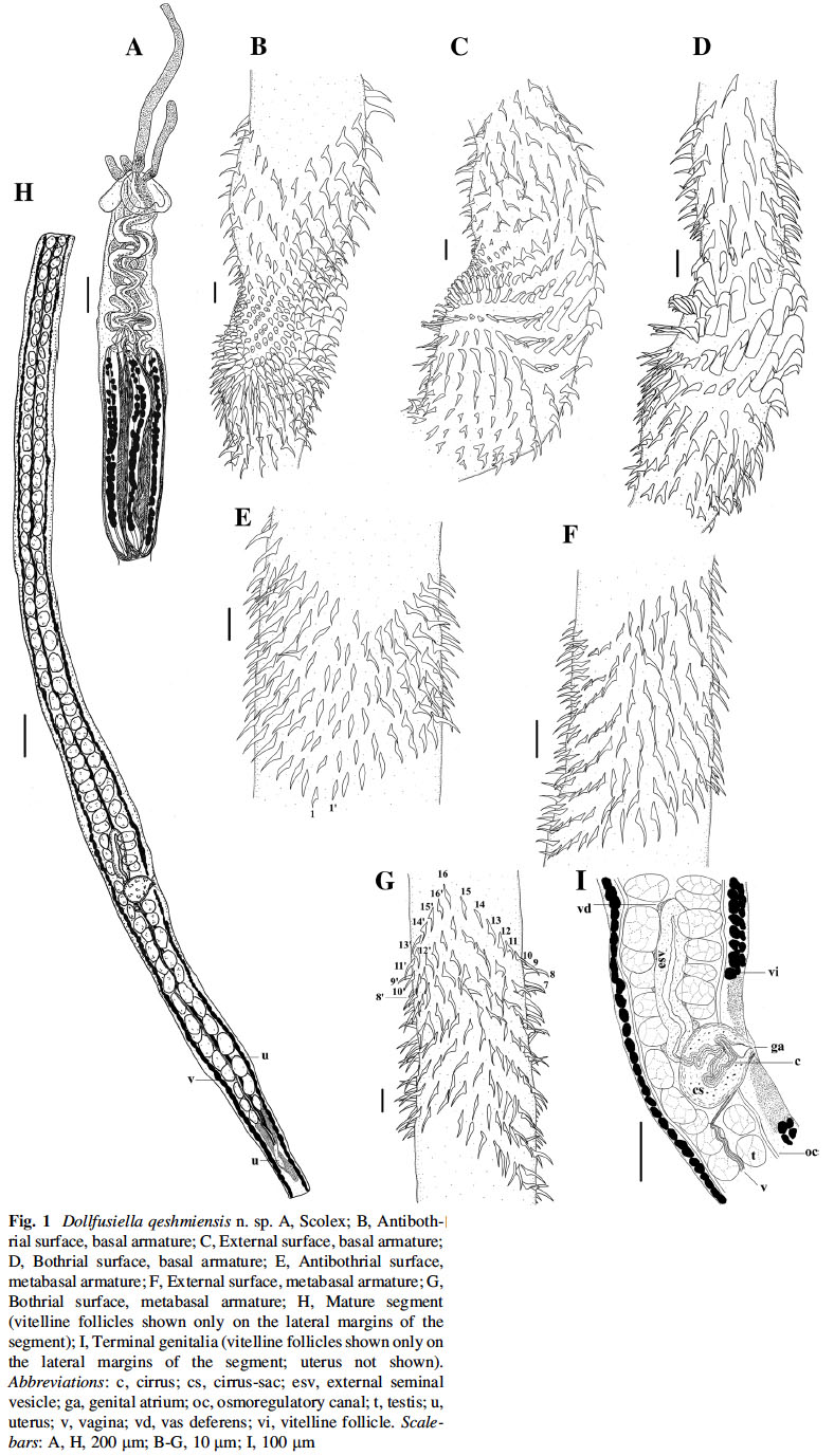 Fig. 1 Dollfusiella qeshmiensis n. sp. A, Scolex; B, Antibothrial surface, basal armature; C, External surface, basal armature; D, Bothrial surface, basal armature; E, Antibothrial surface, metabasal ... MoreFig. 1 Dollfusiella qeshmiensis n. sp. A, Scolex; B, Antibothrial surface, basal armature; C, External surface, basal armature; D, Bothrial surface, basal armature; E, Antibothrial surface, metabasal armature; F, External surface, metabasal armature; G, Bothrial surface, metabasal armature; H, Mature segment (vitelline follicles shown only on the lateral margins of the segment); I, Terminal genitalia (vitelline follicles shown only on the lateral margins of the segment; uterus not shown). Abbreviations: c, cirrus; cs, cirrus-sac; esv, external seminal vesicle; ga, genital atrium; oc, osmoregulatory canal; t, testis; u, uterus; v, vagina; vd, vas deferens; vi, vitelline follicle. Scale bars: A, H, 200 µm; B-G, 10 µm; I, 100 µm |