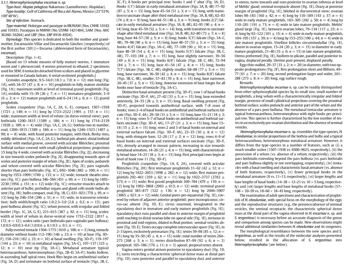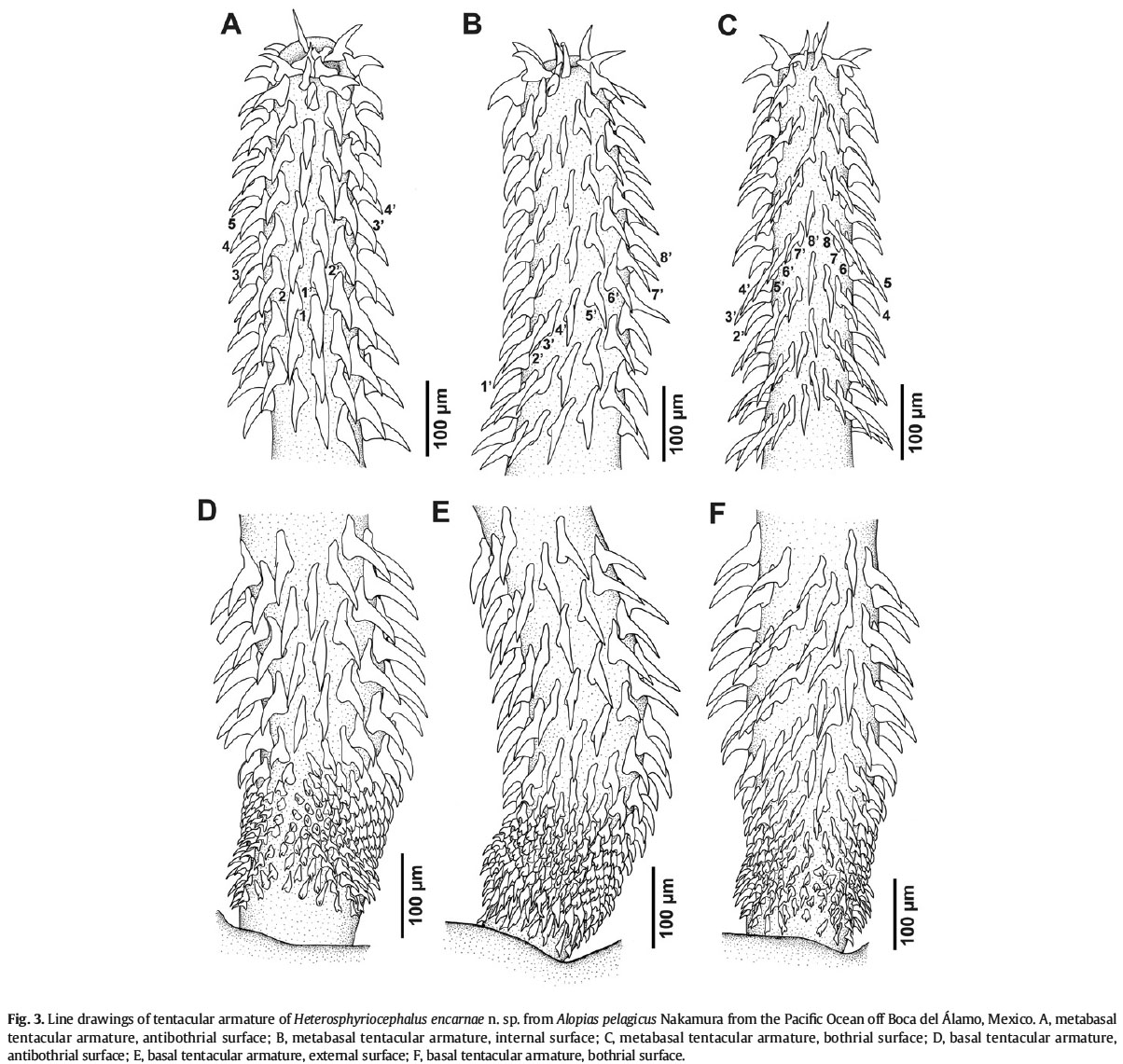 tentacular armatu... MoreFig. 3. Line drawings of tentacular armature of Heterosphyriocephalus encarnae n. sp. from Alopias pelagicus Nakamura from the Pacific Ocean off Boca del Álamo, Mexico. A, metabasal