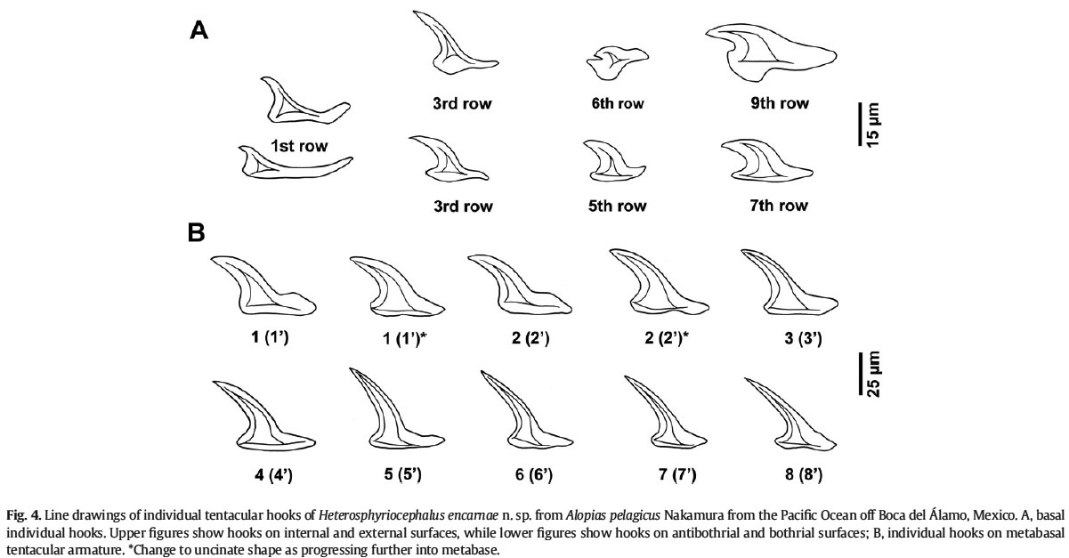 individual ho... MoreFig. 4. Line drawings of individual tentacular hooks of Heterosphyriocephalus encarnae n. sp. from Alopias pelagicus Nakamura from the Pacific Ocean off Boca del Álamo, Mexico. A, basal