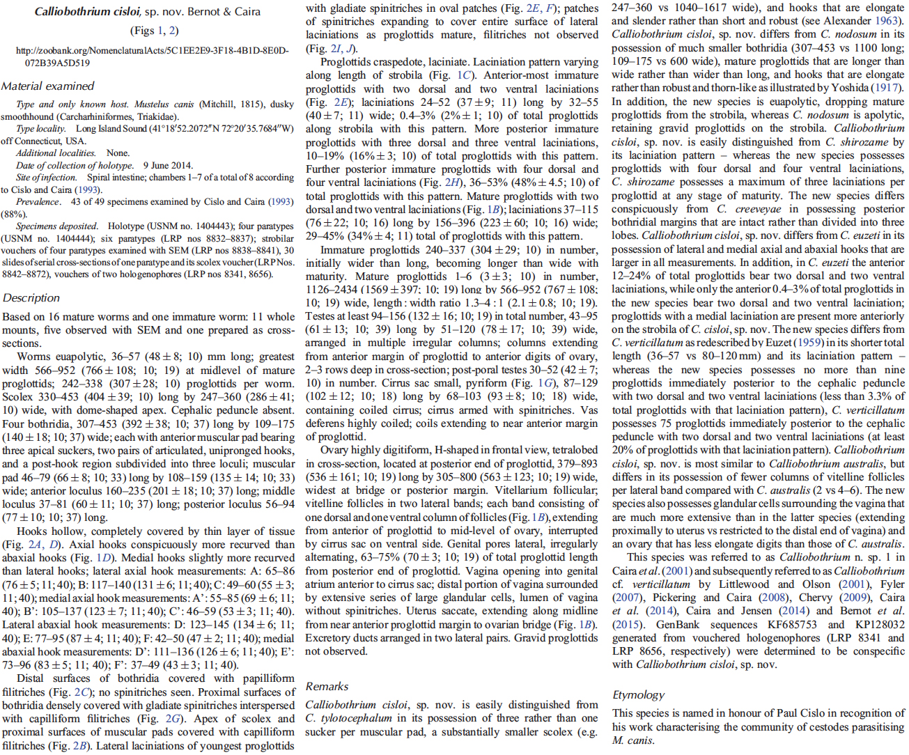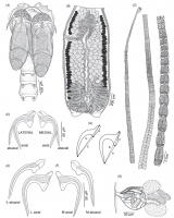 | Voucher Material | strobilar vouchers of four paratypes examined with SEM (LRP nos 8838–8841), 30 slides of serial cross-sections of one paratype and its scolex voucher (LRPNos. 8842–8872), vouchers of two hologenophores (LRP nos 8341, 8656) |