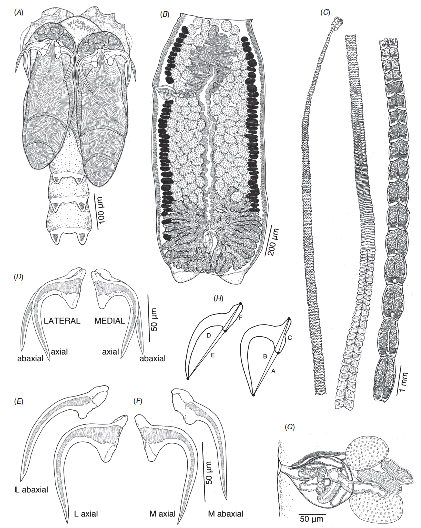 Fig. 1. Line drawings of Calliobothrium cisloi, sp. nov. (A) Scolex (holotype USNM 1404443); (B) mature proglottid (paratype LRP 8833); (C) mature worm (holotype USNM1404443); (D) detail of medial and lateral hooks (holotype USNM1404443); (E) detail of abaxial hooks; (F) detail of axial hooks; (G) terminal genitalia (paratype LRP 8833); (H) hook measurements taken. Abbreviations: L, lateral; M, medial.