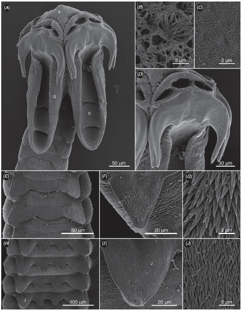 (G) microtriches on proximal surface of bothridium; (H) proglottids with four laciniations; letter indicates area detailed by micrograph J; (I) enlarged view of lower left laciniation depicted in micrograph H; letter indicates area detailed by micrograph J; (J) detail of microtriches on distal surface of lateral laciniation in micrograph I.