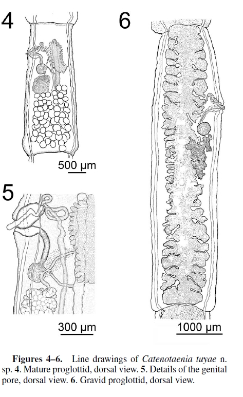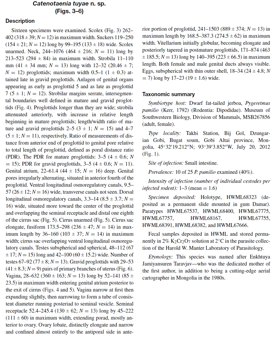 Dursahinhan, A.T, B. Nyamsuren, D.M. Tufts, and S.L. Gardner. 2017. A New Species of Catenotaenia (Cestoda: Catenotaeniidae) from Pygeretmus pumilio Kerr, 1792 from the Gobi of Mongolia. Comparative Parasitology 84(2): 124-134. (7032) Download PDF |