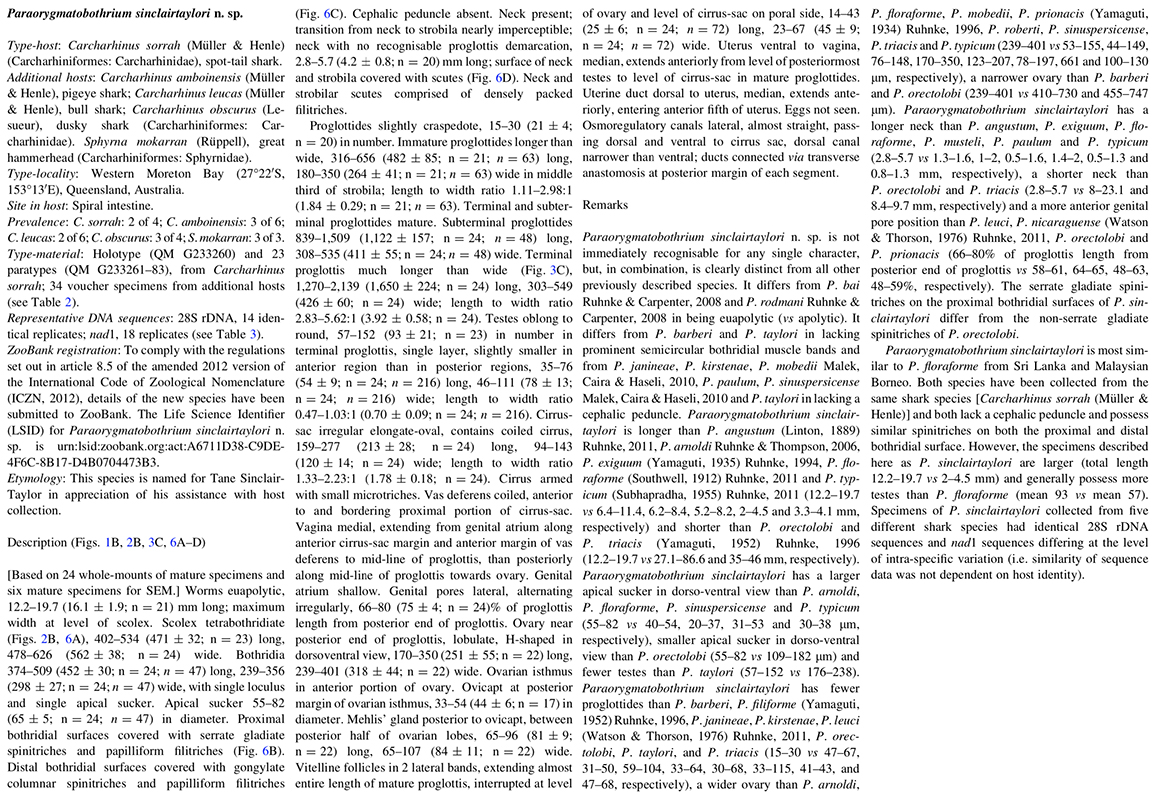 | Type Material | Holotype (QM G233260) and 23 paratypes (QM G233261–83) (from Carcharhinus sorrah) |