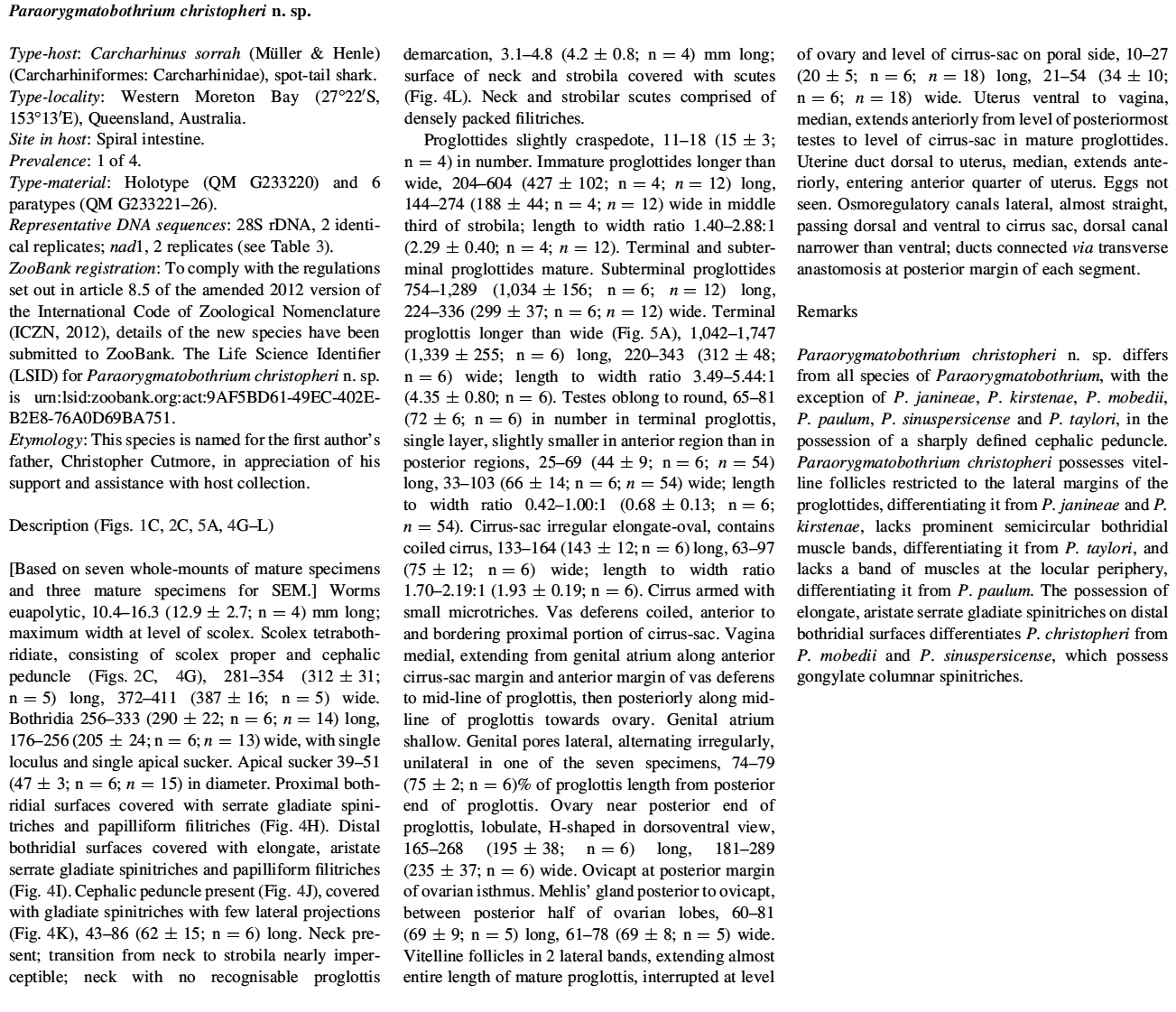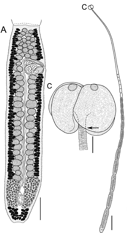 Fig. 2 Spec... MoreFig. 1 Species of Paraorygmatobothrium from Moreton Bay, Australia, whole worms. C, Paraorygmatobothrium christopheri n. sp. ex Carcharhinus sorrah (holotype QM G233220); scale-bar: 1 mm.