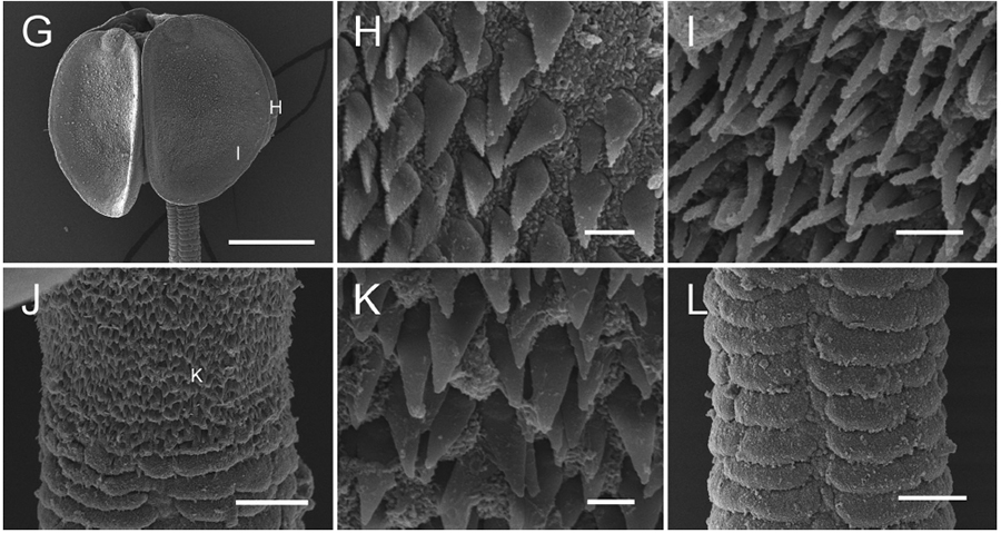 where K was taken; K, Cephalic peduncle surface; L, Anterior region of neck. Scale-bars: G, 100 µm; H, I, K, 1 lm; D, 50 µm; L, 10 µm. |
