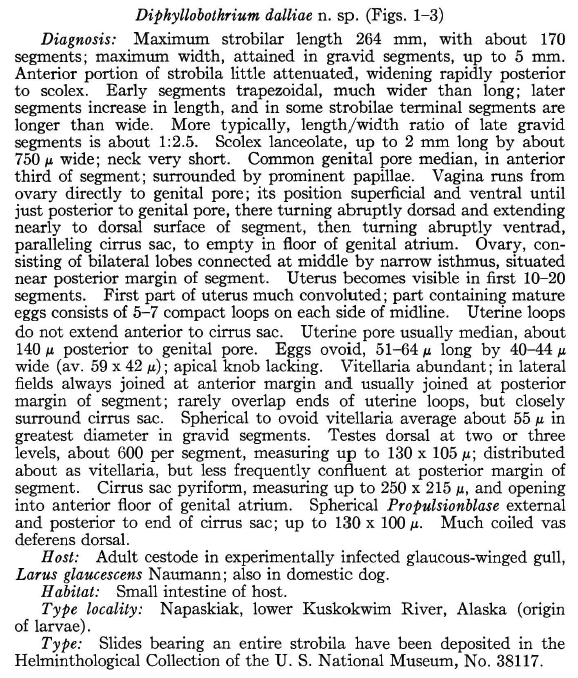 Rausch, R. L. 1956. Studies on the helminth fauna of Alaska. XXVIII. The description and occurrence of Diphyllobothrium dalliae n. sp. (Cestoda). Transactions of the American Microscopical Society 45: 180–187. (6584) Download PDFWaeschenbach, A., J. Brabec, T. Scholz, D. T. J. Littlewood, and R. Kuchta. 2017. The catholic taste of broad tapeworms – multiple routes to human infectio. International Journal for Parasitology 47: 831–843. (7057) Download PDF |