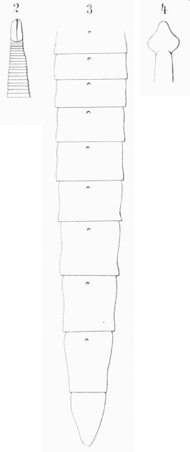 Fig. 2. Dibothriocephalus römeri spec. nov. Scolex und erste Glieder, Ventralansicht. Fig. 3. D. römeri nov. spec. Letzte Proglottiden, ventral. Fig. 4. D. römeri nov. spec. Scolex, Marginalansicht.