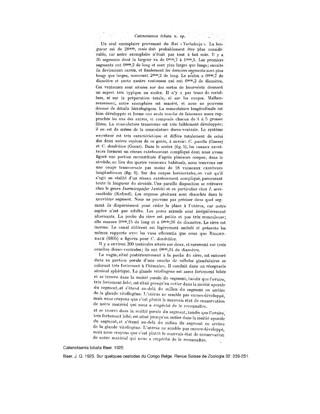 Baer, J. G. 1925. Sur quelques cestodes du Congo belge. Revue Suisse de Zoologie 32: 239-251.