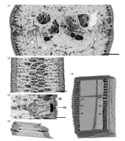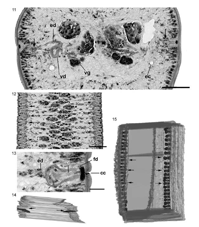 Figs 11-15: longitudinal and cross-sections of mature segments embedded in Historesin and three-dimensional (3D) reconstruction based on serial longitudinal sections of a strobila segment. 11: cross-section of mature segments showing testis (T), ejaculatory ducts (ed), vitelline glands (vg), viteline duct (vd), excretory channels (ec) and two cirrus (c) pouches (arrows) (Bar = 100 μm); 12: longitudinal section of a strobila with mature segments showing the presence of two c pouches (arrows) in each lateral side of the strobila (Bar = 100 μm); 13: detail of a c pouch in a longitudinal section of mature segments in which it is possible to observe the insertion of ed, c, female duct (fd) and the copulatory channel (cc) (Bar = 100 μm); 14: superior view of in the transversal axis of 3D reconstruction where is possible to observe the internal position of two lateral rows of c pouches (arrows); 15: dorsoventral view in 3D reconstruction showing the position of c pouches (arrows) in each lateral margin of the strobila.