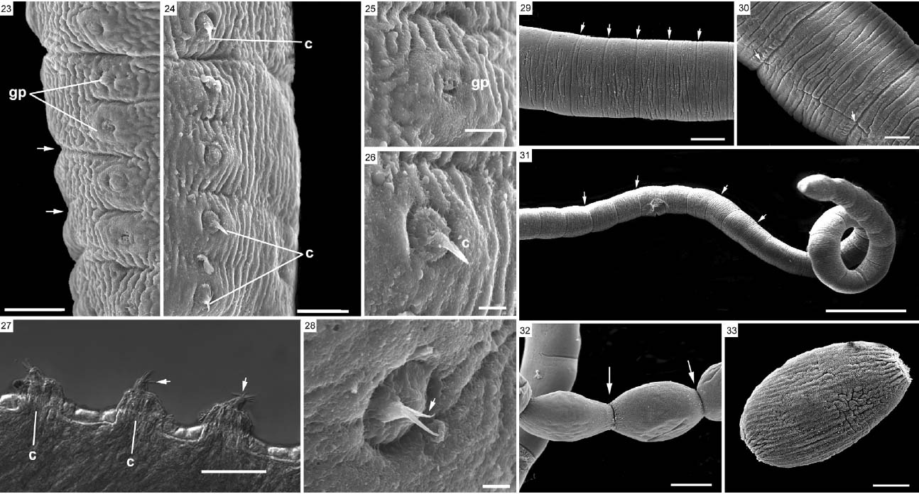 Figs 29-33: scanning electron microscopy of mature and gravid segments of Lanfrediella amphicirrus gen. nov. sp. nov. 29: mature segments of parasite showing the segmentation (arrows) (Bar = 100 μm); 30: gravid segment view in strobila where is possible to observe the segmentation (arrows) (Bar = 100 μm); 31: posterior end of a strobila showing the segmentation of gravid segments (arrows) (Bar = 400 μm); 32: end portion of the parasite showing the constrictions between gravid segments (arrows) (Bar = 100 μm); 33: isolated gravid segment. Note the elliptical morphology, characteristic of this stage, and the absence of genital pores (Bar = 50 μm).