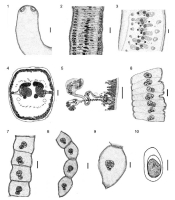 Figs 1-10: light microscopy of Lanfrediella amphicirrus gen. nov. sp. nov. 1: dorsoventral view of the scolex (Bar = 100 μm); 2: immature segments in a dorsoventral view (Bar = 50 μm); 3: mature segments (Bar = 50 μm); 4: cross section of mature segment showing two groups of reproductive organs and two cirrus pouches (Bar = 50 μm); 5: reconstruction of a cirrus pouch with cirri showing the genital atrium, deferent channel and vaginal channel (Bar = 50 μm); 6: pregravid strobila segments showing the initial region of segmentation (Bar = 100 μm); 7: gravid segments showing the maturation of the paruterine capsules and visible segmentation (Bar = 100 μm); 8: posterior extremity showing gravid segments (Bar = 100 μm); 9: detail of a gravid segment where it is possible to observe two paruterine capsules per segment (Bar = 50 μm); 10: details of eggs showing the outer envelope, embriophore, and the oncosphere (Bar = 30 μm).