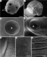 Figs 16-22: scanning electron microscopy of Lanfrediella amphicirrus gen. nov. sp. nov. 16: general view of relaxed scolex showing the suckers (S), absence of a rosteolum or apical organ (Bar = 100 μm); 17: overall view of contracted scolex showing morphology of S in this moment (Bar = 100 μm); 18: internal details of S (asterisk) in contracted scolex. Note the absence of spines or any other structures (Bar = 10 μm); 19: internal details of S (asterisk) in contracted scolex (Bar = 100 μm); 20: details of the microtriches close to border of S (Bar = 10 μm); 21: details of microtriches in immature segments (Bar = 10 μm); 22: details of microtriches in mature segments (Bar = 10 μm).