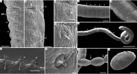 Figs 23-28: scanning electron microscopy of mature segments and differential interference contrast (DIC) of mature segments of Lanfrediella amphicirrus gen. nov. sp. nov. 23: lateral view of a mature segment showing the segmentation (arrow) and genital pores (gp) (Bar = 26 μm); 24: view of the opposite side of the segment in Fig. 23 showing the gp and a partly extroverted (C) (Bar = 20 μm); 25: view of the region of the gp region observed in Fig. 23 (Bar = 10 μm); 26: details of the cirrus (c) located in the mature segment observed in Fig. 24 (Bar = 5 μm); 27: image of DIC of mature segments with the best-adjusted focus obtained using the CombineZP software showing c extroverted with many spines (arrows)