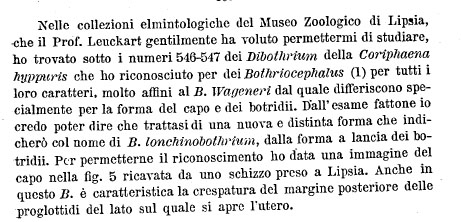 | Specimen Notes | -"Nelle collezioni elmintologiche del Museo Zoologico di Lipsia, che il Prof. Leuckart gentilmente ha voluto permettermi di studiare, ho trovato sotto i numeri 546-547 dei Dibothrium dell,a Coriphaena hyppuris" |