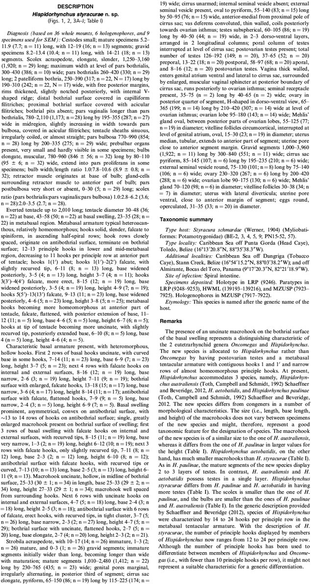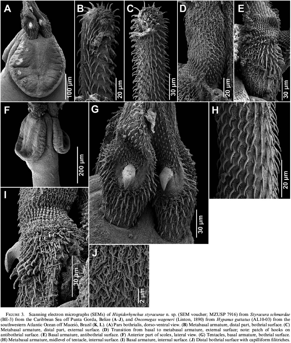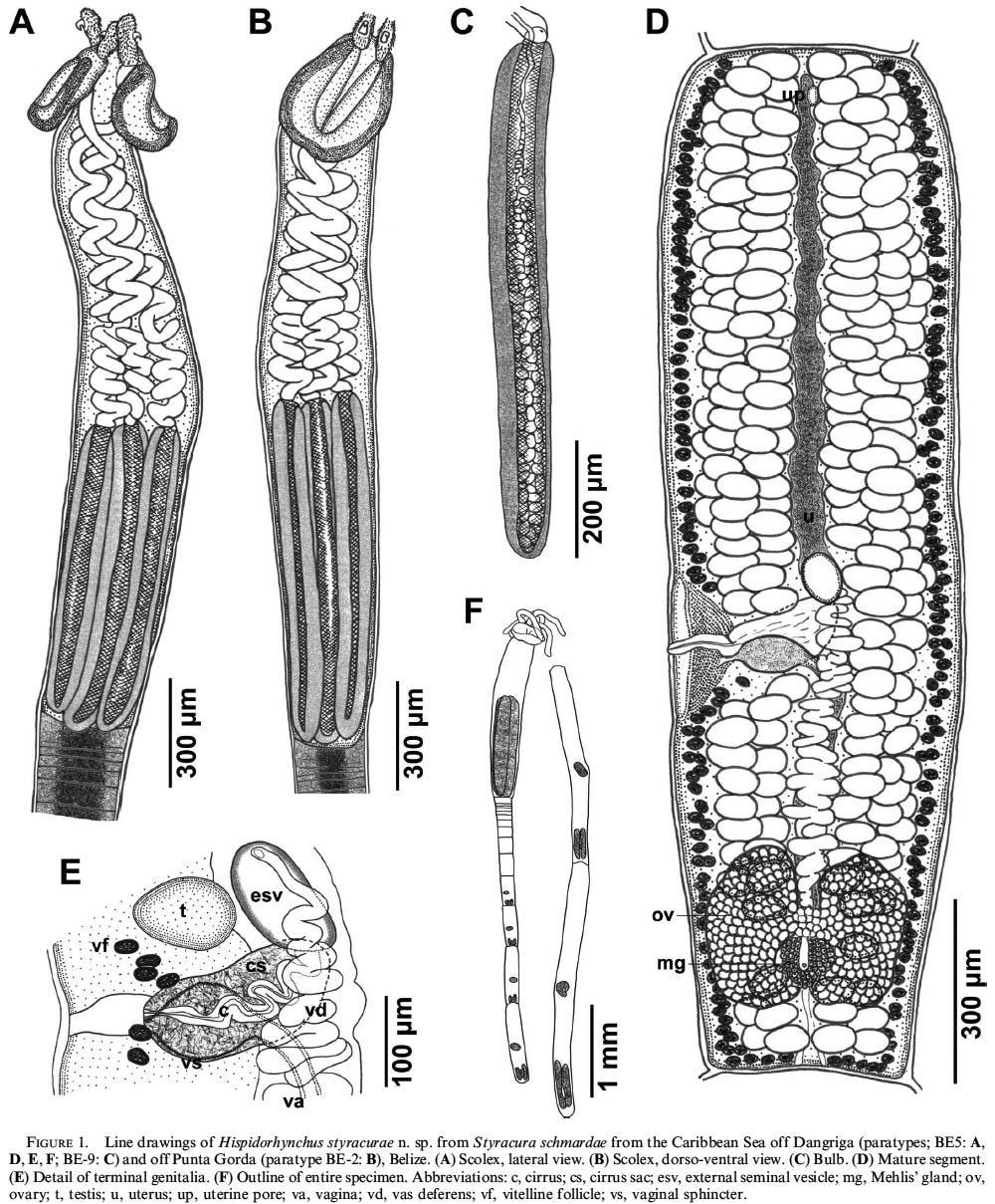 Schaeffner, B. C. 2018. Hispidorhyncus styracurae n. sp. (Trypanorhyncha: Eutetrarhynchidae) from the Chupare stingray, Styracura schmardae (Werner), from the Caribbean Sea, including new records of Oncomegas wageneri (Linton, 1890). Journal of Parasitology 104(6): 685–696.